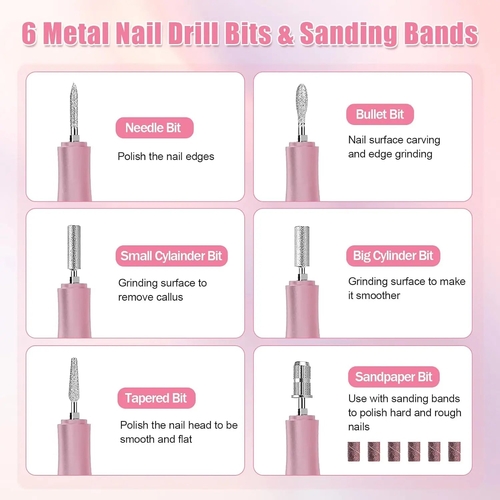 Muti-Functional: Electric nail file comes with 6 metal drill bits and 6 sanding bands satisfies your needs for acrylic nails, gel nails, Natural nails, cuticles or dead skin for polishing, shaping, buffing, grinding and other nail art needs.