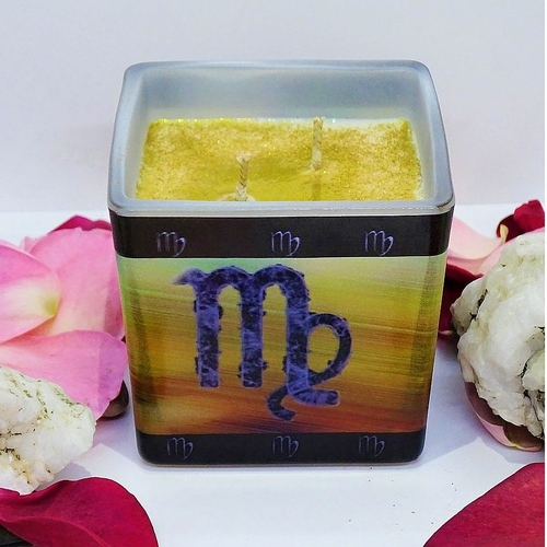 The zodiac sign of Virgo on the square glass comes to life when the candle is lit. When the wax melts, the glitter sparkles with the light of the flame as it releases its aroma. With a cork lid that protects the candle from dust when not in use.