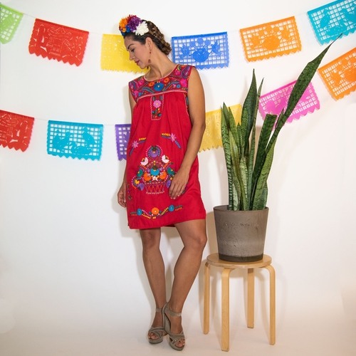Enjoy this bohemian and super comfortable red dress that has all the cheerfulness of multi-color flowers and all the delicacy of hand embroidery work behind.