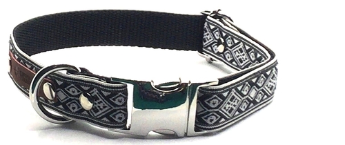 Durable Designer Hand Made Dog Collars which are practical and stylish for the Dog on the Go. This Pattern was designed for a Medium Sized Dog Breed and has a width length of 20mm. The Metal Hardware is also 20mm. This Pattern can be made to fit larger dogs, but please be aware that the Strength of the Hardware increases with its large size. Some Clients prefer having a thinner collar on their dogs, and only use the Collar for Style, or to hold their Dog Tags.