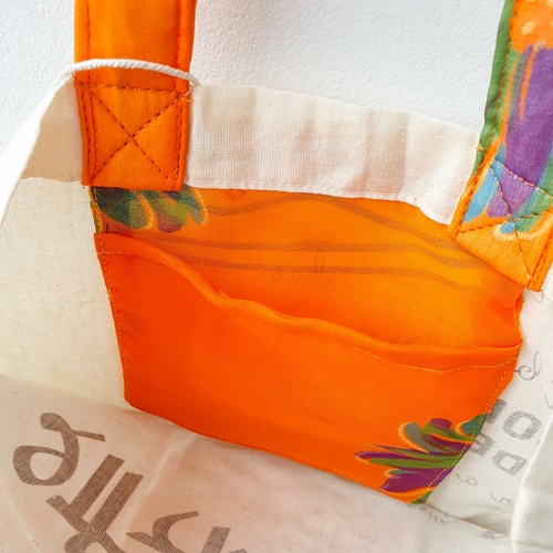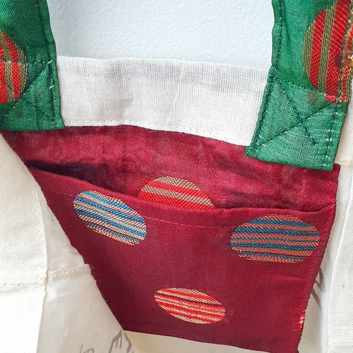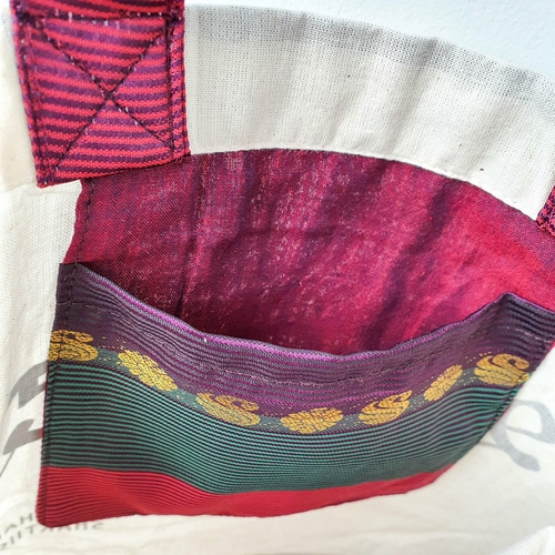These vibrant one-of-a-kind repurposed sari shopping bags are meticulously handcrafted by empowered artisan makers in Pondicherry, India. They’re gorgeous, hand-printed with natural inks on both sides, one side proclaims “This bag provides economic independence for a woman in India” and the other side says S hanging inner side pocket made from the same sari used for the exterior of the bag. The handle for each bag is also made from the same sari – creating a beautiful reusable tote bag from repurposed sari cloth.