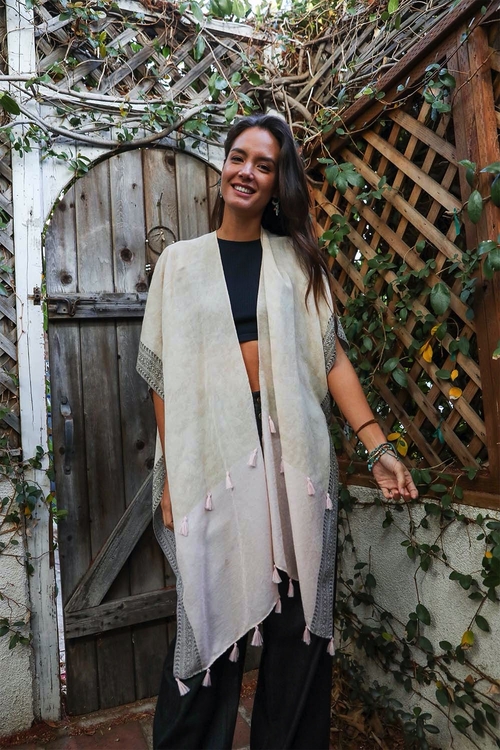This is the perfect kimono to wear when you want to look chic and stylish. The two-tone color gives it a unique look, while the tassels add a touch of fun. It’s the perfect way to update your wardrobe and add a little bit of glamour.