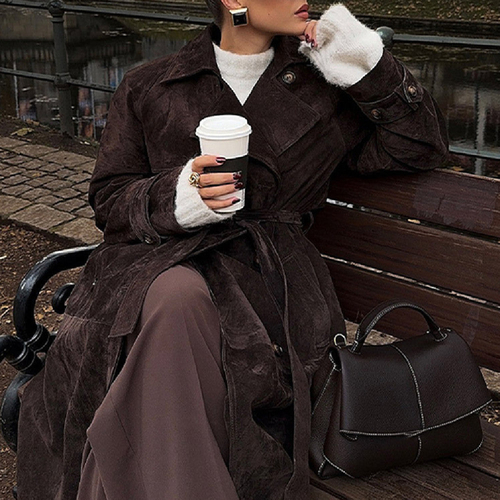 This double-breasted coat channels heritage charm with a tailored silhouette. In rich brown and polished lines, it’s your go-to for poised and polished autumn days.